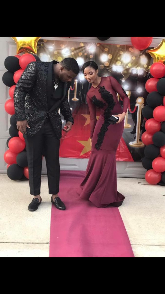 Burgundy Wine Red Mermaid Satin Prom Dresses Crew Neck Black Appliques Keyhole Back Evening Dresses Long Party Gowns Vestidos