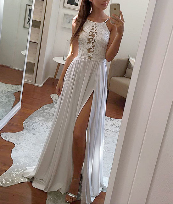 Simple White Lace Applique Halter Prom Dress,Long Evening Dress with Side Slit,Floor Length Formal Dress