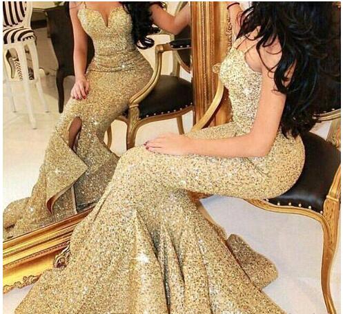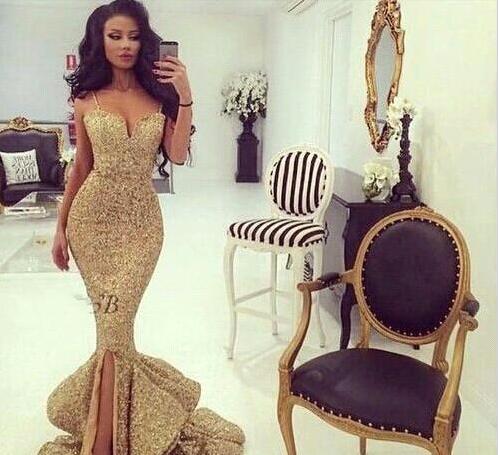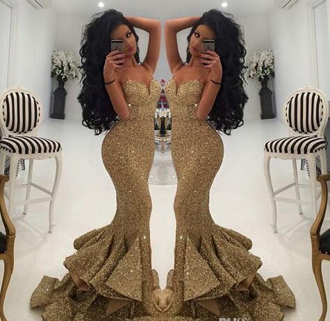 New Designer Bling Gold Sequins Mermaid Prom Dresses 2017 Spaghetti Open Back Ruffles Sweep Train Evening Gowns Pageant Dress Formal BA1086