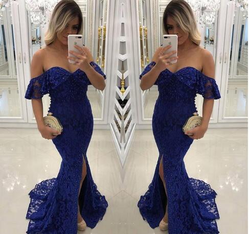 Royal Blue Mermaid Prom Party Dress Off the Shoulder Illusion Long Sleeves Beads Crystal Lace Appliques Arabic Evening Gown
