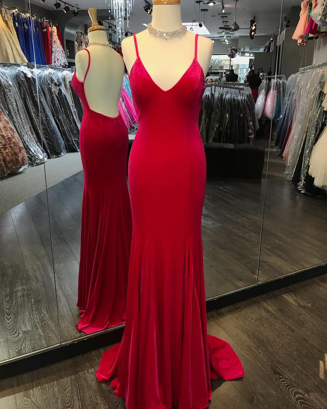 Red Mermaid Prom Dress, Sexy Backless Prom Dresses, Long Spaghetti Straps Evening Party Dress
