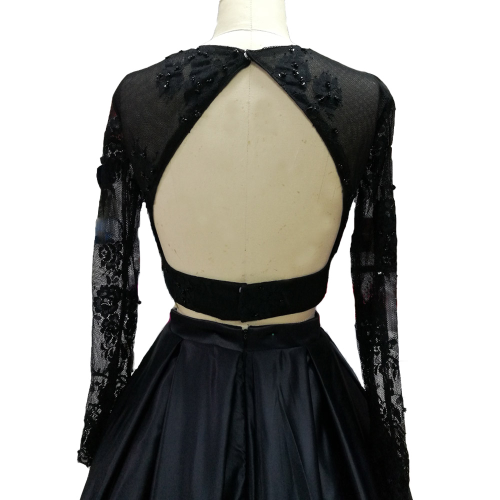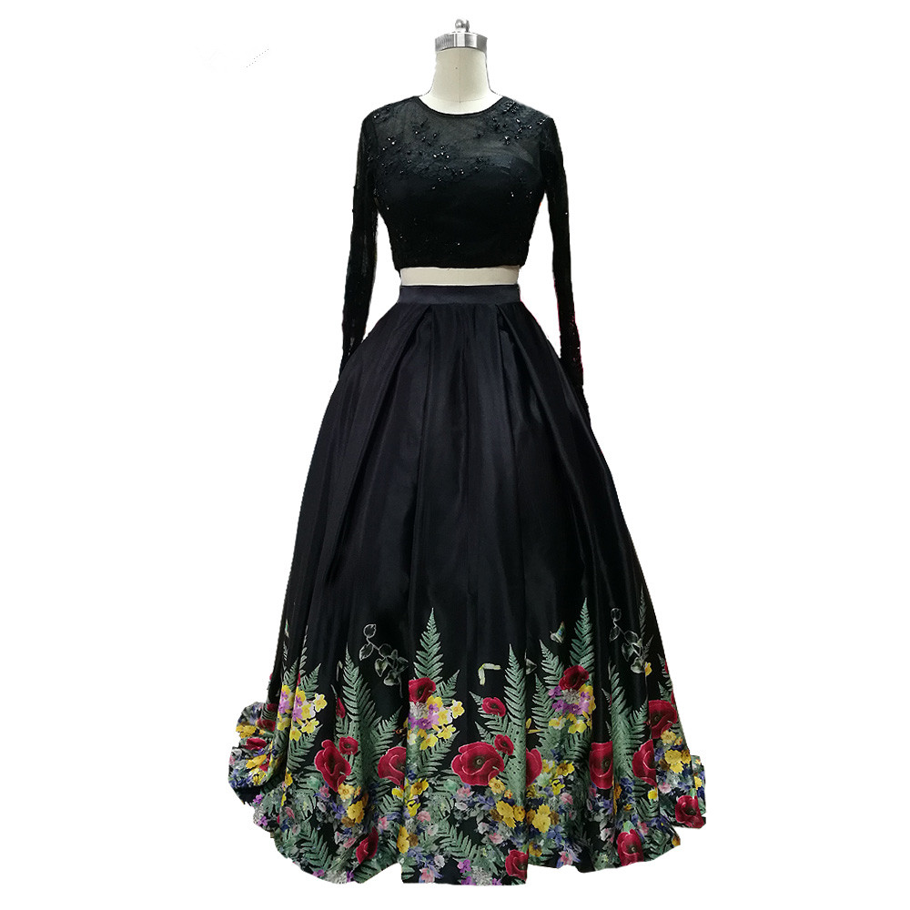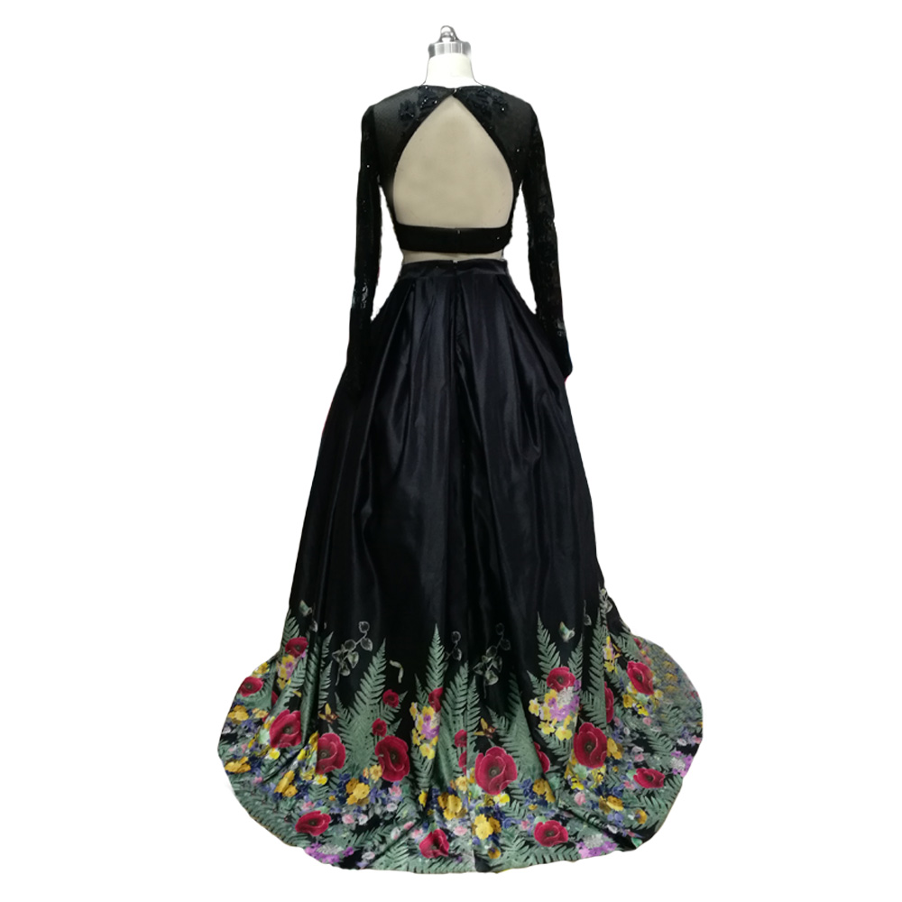 Black Print Floral Ball Gown Prom Dresses Long 2017 Keyhole Back Long Sleeves Evening Party Dresses 2 Piece