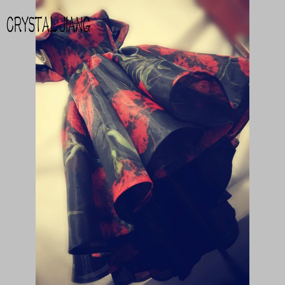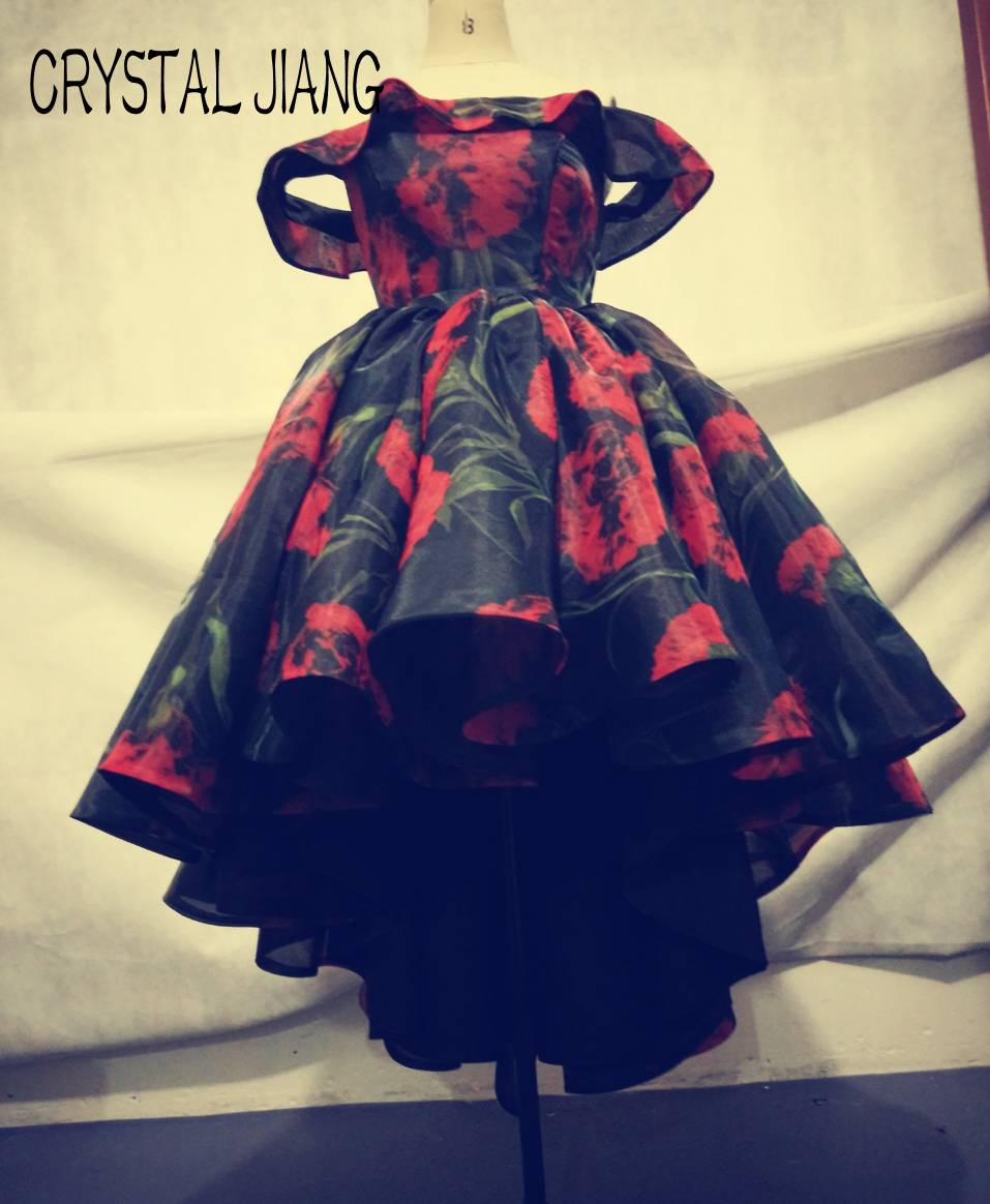 2018 Off the Shoulder Floral Rose Printed Organza Ruffles High-low Puffy Ball Gown Prom Dresses