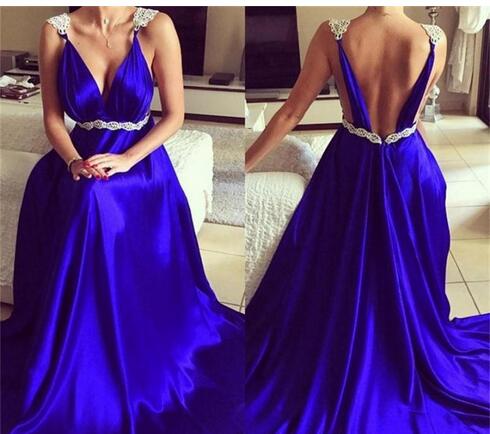 Elegant Royal Blue Evening Gowns 2017 Deep V Neck Spaghetti Straps A Line Prom Dresses Chiffon Floor Length Formal Party Dresses