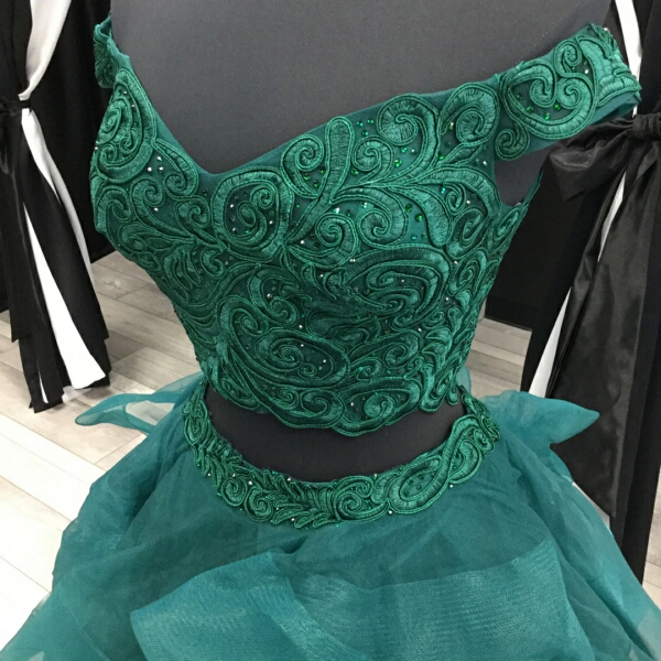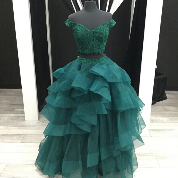 Elegant Two Piece A-Line Off-The-Shoulder Green Tiered Long Prom Dress With Appliques