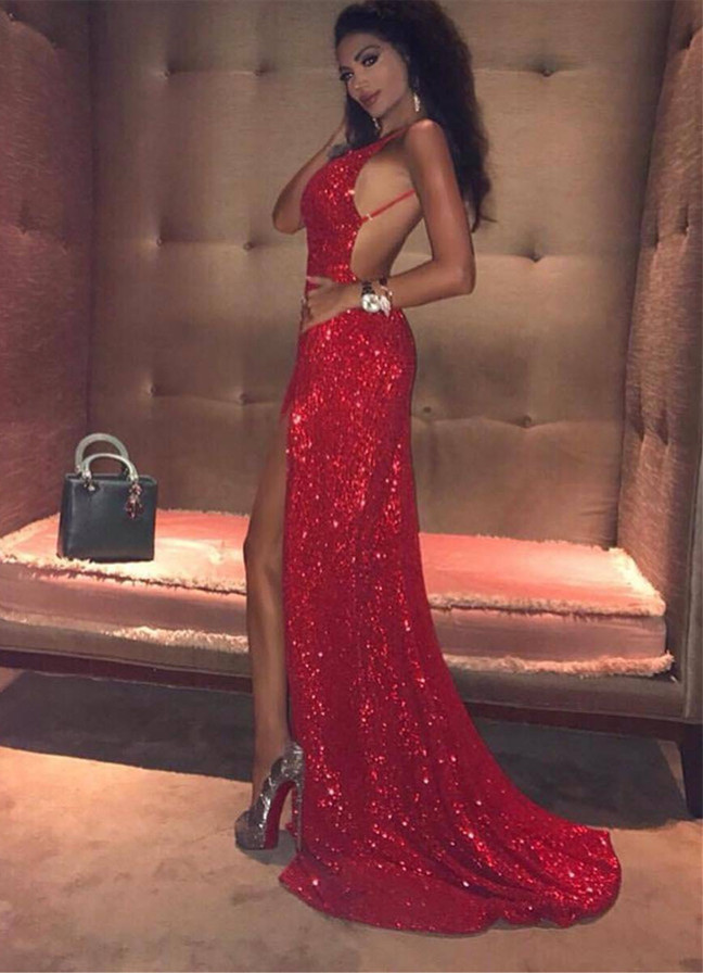 Sexy Sleeveless Red Mermaid Evening Dress, Split Slit Backless Sequins Mermaid Prom Dress