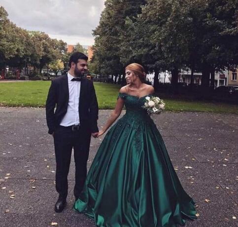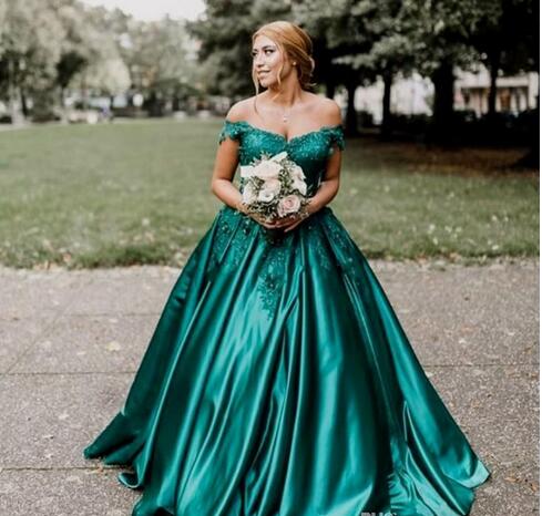 Dark Green Plus Size Evening Dresses Off Shoulder Appliques Beaded Satin Ball Gown Prom Dresses Formal Evening Dress 2018 Evening Gowns