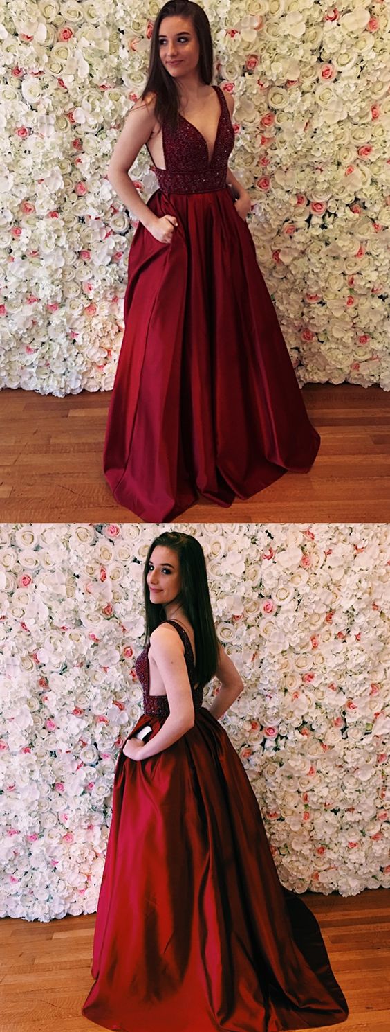 A-Line V-Neck Sweep Train Burgundy Satin Prom Dress with Beading Pockets, Satin Beading Evening Formal Gowns