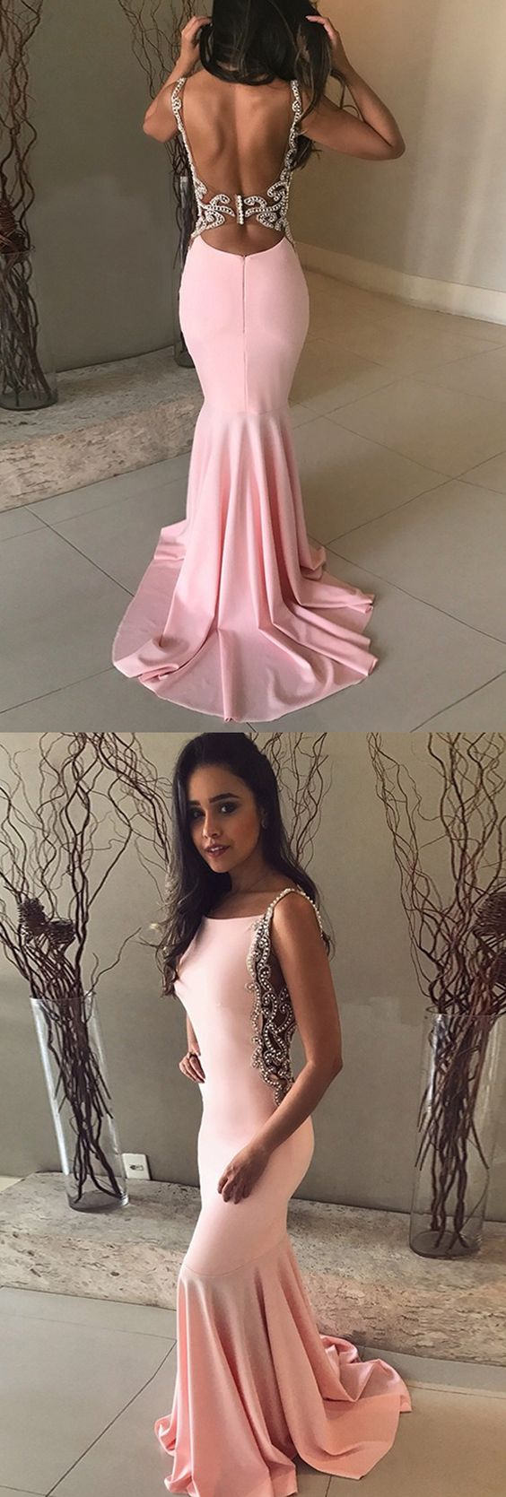 Mermaid Bateau Backless Sweep Train Pink Prom Dress with Beading
