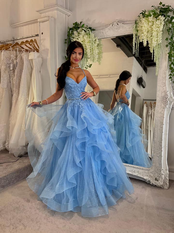 Blue Ball Gown Lace Appliques Tiered Sequins Prom Dress Evening Dress