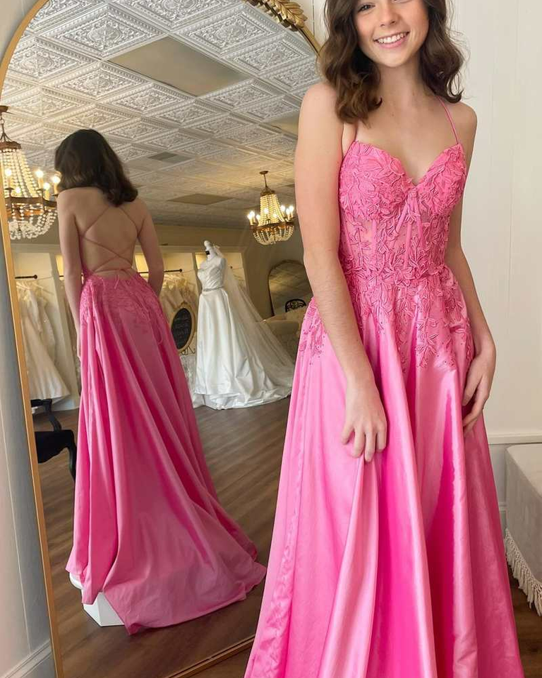 Pink A Line Lace Appliques Prom Dress Evening Dress