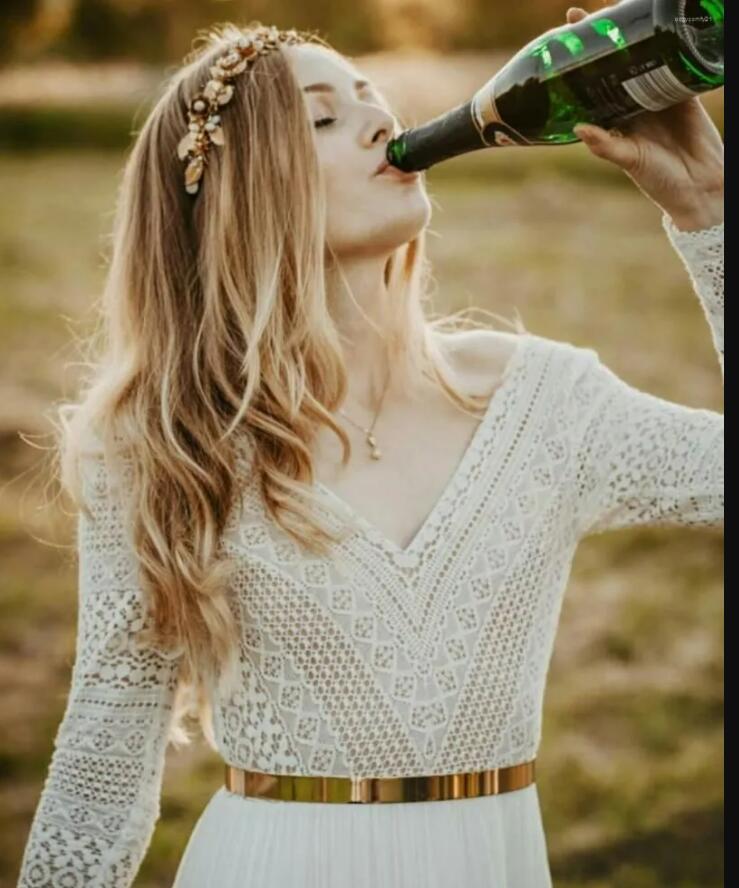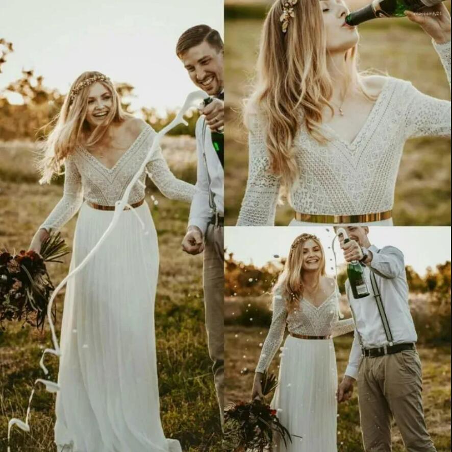 Boho Country Wedding Dresses Bridal Gown Lace Chiffon A Line Simple Garden V Neck Long Sleeves Plus Size Custom Made Garden Beach vestido de novia