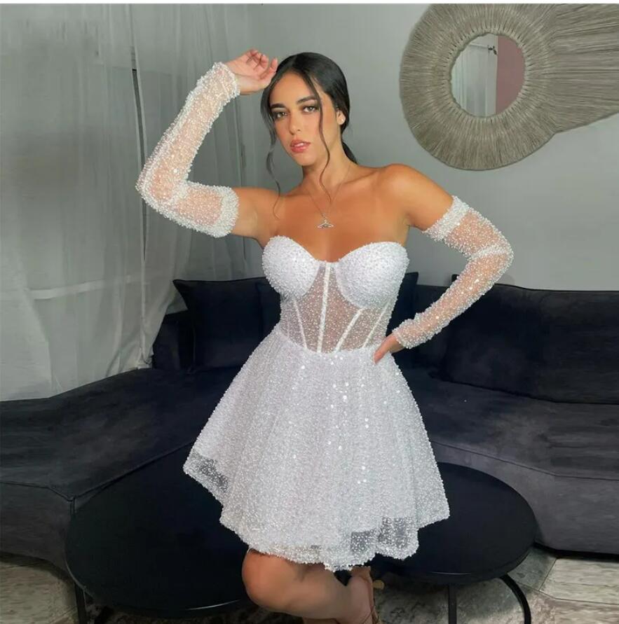 New Glitter Pearls Tulle Short Wedding Dress Sweetheart Sleeves Saudi Arabic Sparkly Sequine Bride Party Gowns Robe De Soiree