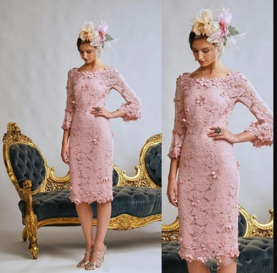 Sexy Short Pink Mother of bride dresses Illusion Full Lace Hand Made Flowers Knee Length Plus Size Party Wedding Guest Gowns Long Sleeves