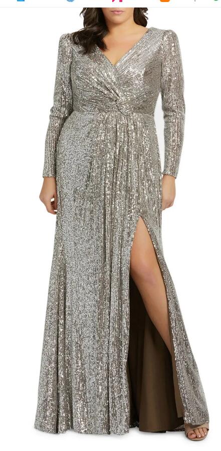 Silver Sequins Lace Plus Size Long Sleeve Mother of Bride/Groom Dress EVening Dress