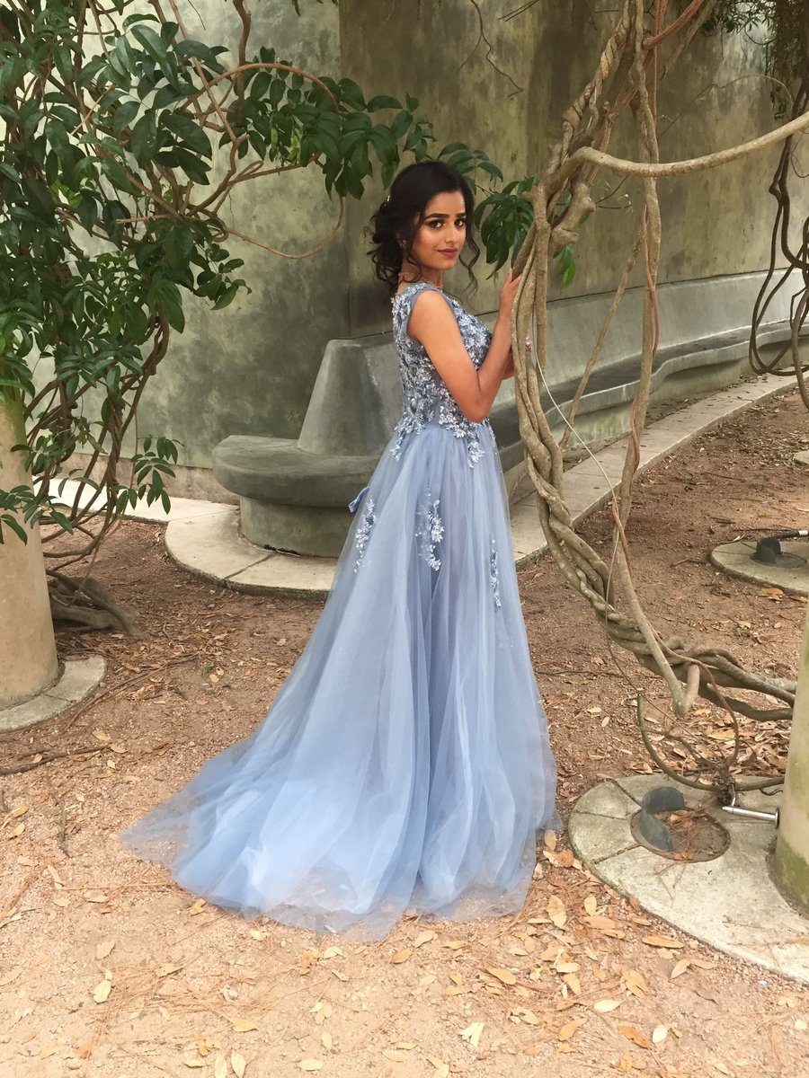 Baby Blue Ball Gown Tulle Prom Dresses White Appliques Sleeveless Evening Dresses Party Gowns Vestidos