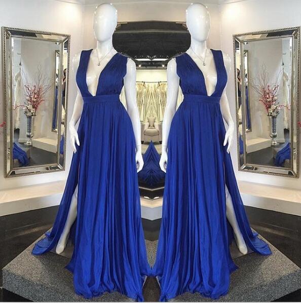 Sexy Slit Prom Dress,Royal Blue Evening Dress,Sexy Deep V-neckline Prom Gown,Slit Graduation Dress