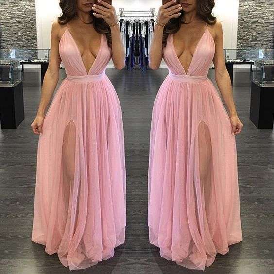 Pink A Line Tulle Prom Dresses Sexy Deep V Neck Sleeveless Evening Dresses Party Gowns
