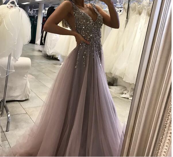 2018 Light Grey A Line Tulle Prom Dresses Sexy Deep V Neck Beading Crystals Evening Formal Dress Gowns