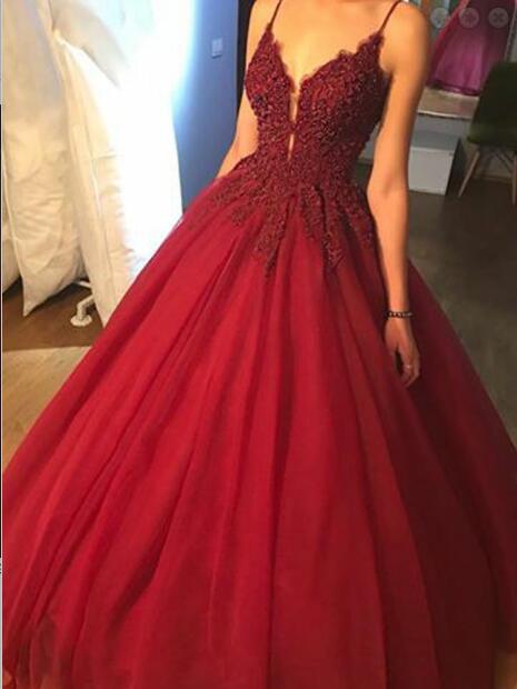 Spaghetti Straps Burgundy Prom Dress with Beading,V-Neck Lace Ball Gowns