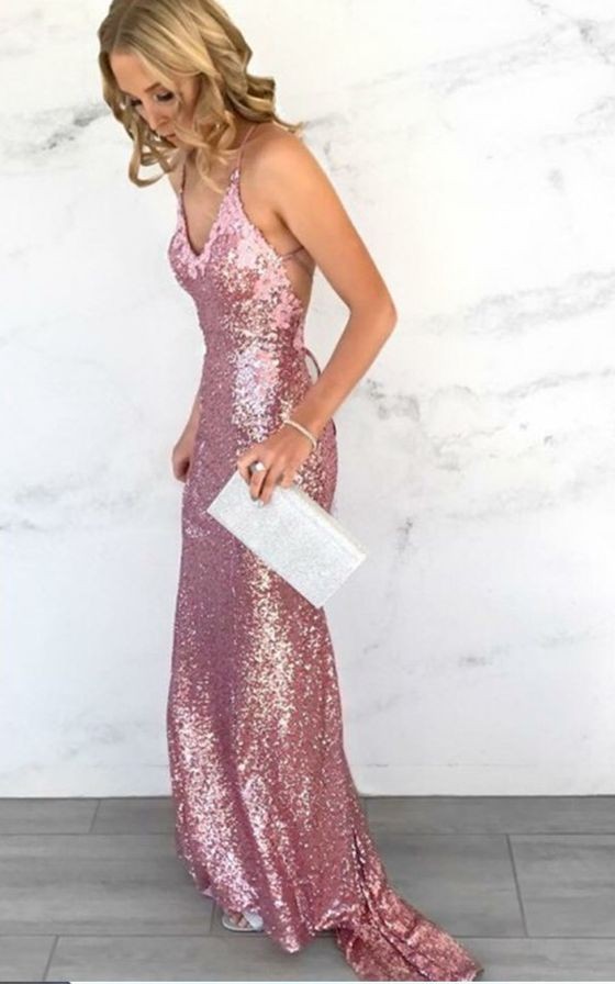 Rose Pink Mermaid Prom Dresses, Sequins Party dresses, Elegant Backless Sequined Party Dresses, Unique Criss Cross Straps Evening Dresses