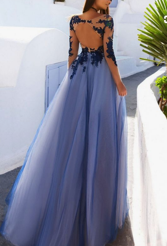 Charming ,Long Sleeve ,Appliques ,Sexy Prom Dress,See Though Evening Dress,Blue Prom Dresses