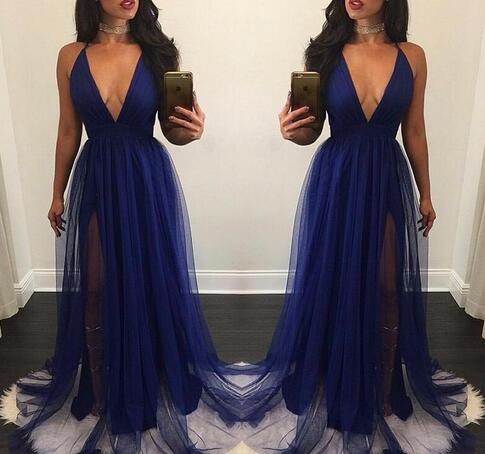 Cheap Royal Blue Long Prom Dresses 2018 Simple Sexy Deep V-Neck Side Split Formal Party Dress Vestido de festa Evening Celebrity Gowns