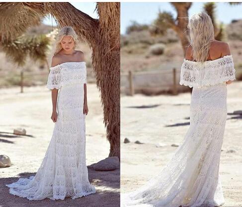 Hot Sale Summer 2018 Full Lace Bohemian Wedding Dresses Off Shoulder Plus Size Cheap Boho Hippie Court Train Bridal Wedding Gowns