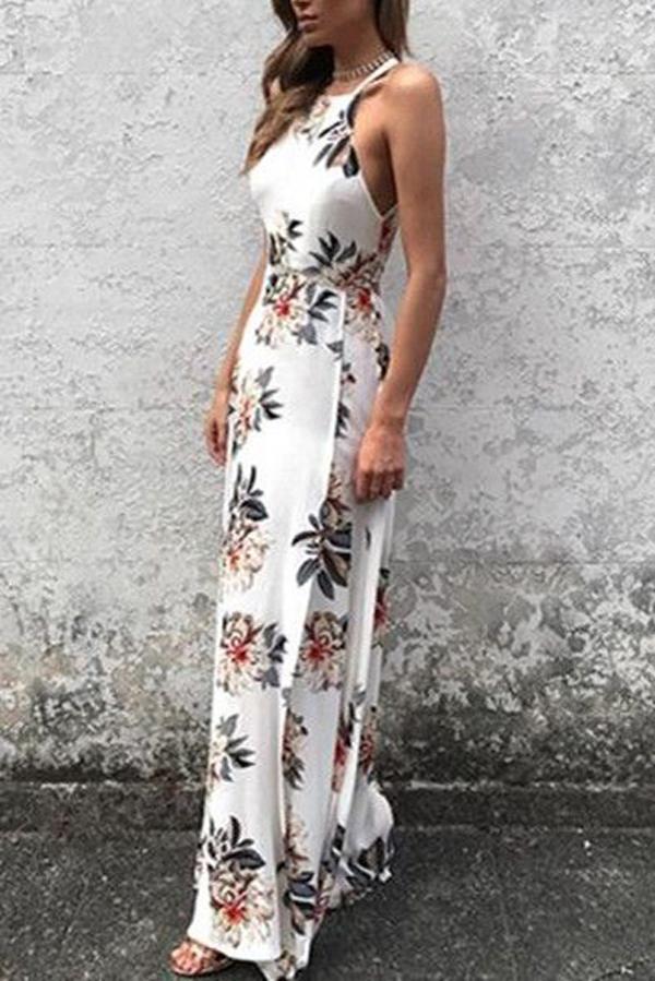 Simple Halter Side Slit Prom Dress,Floral Print Key Hole Back Evening Dress