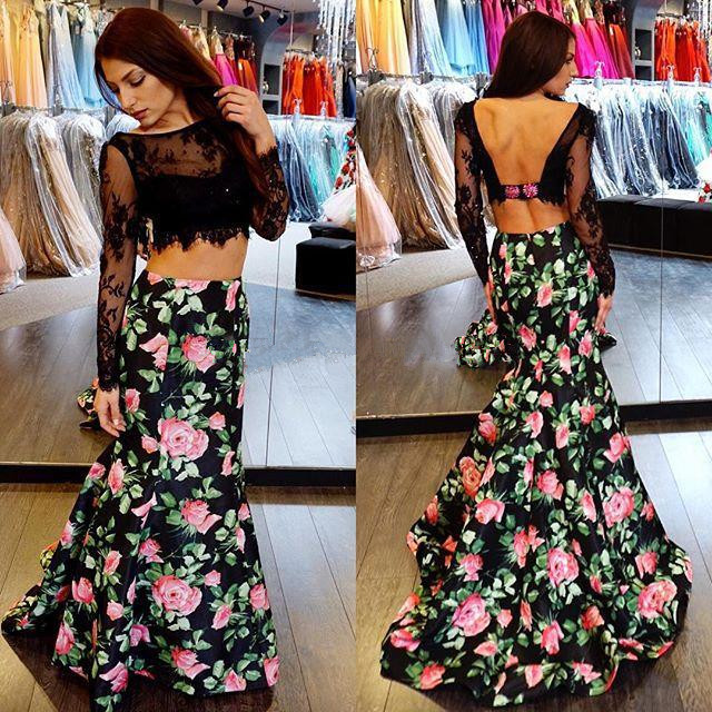 Beaded Lace Floral Print 2PC Prom Homecoming Dress 2018 Mermaid Pattern Skirt Two Piece Open Back Sexy Evening Gown