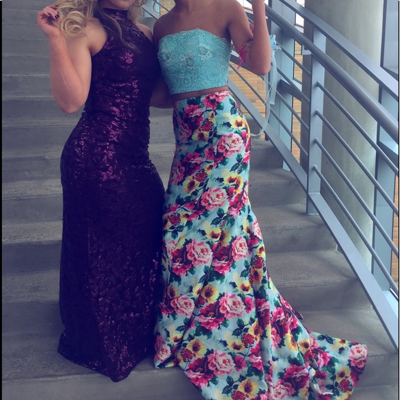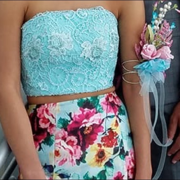 Blue Two Pieces Mermaid Prom Dresses Strapless Sleeveless Lace Bodice Print Floral Evening Dress Formal Gowns
