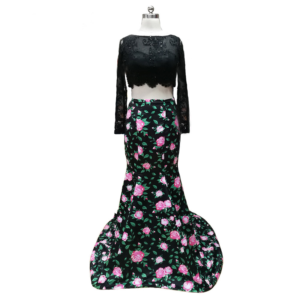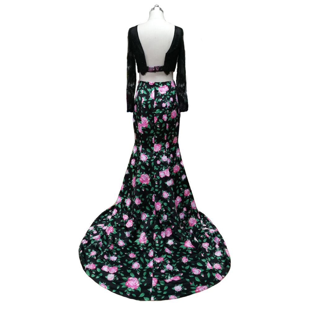 Black Floral Print Mermaid Prom Dresses Long 20187 Long Sleeves 2 Piece Keyhole Back Evening Party Dresses