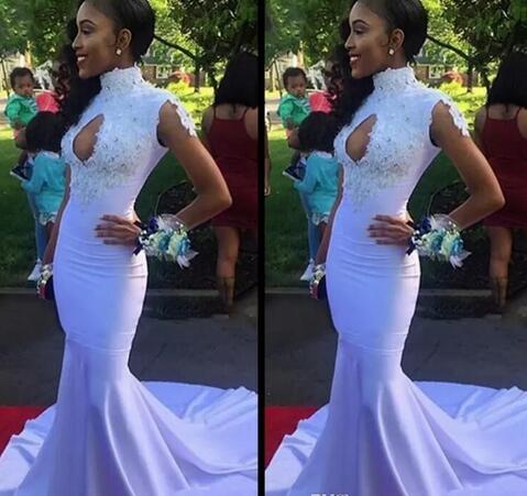 New Vestidos Mermaid High Neck Prom Dresses 2018 Sexy Hollow Out Cap Sleeves Lace Beaded Long Evening Party Gowns Black Girls Wear