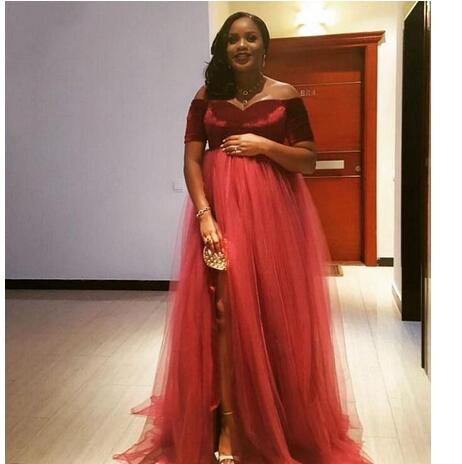 2018 Maternity Evening Dresses Velvet Short Sleeves Plus Size Prom Dresses Side Split Tulle Sexy Vestidos De Festa