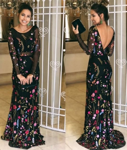 Black Sheath Embroidery Prom Dresses Scoop Sheer Long Sleeve Floral Evening Formal Gowns