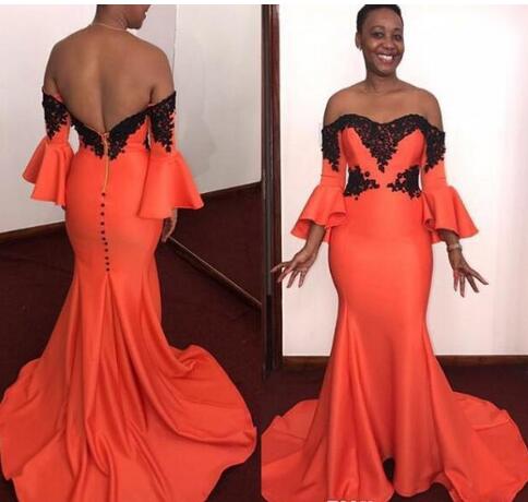 2018 Off Shoulder Afircan Evening Dresses Formal Party Dress Sexy Back Half Sleeves Lace Applique Mermaid Prom Dress