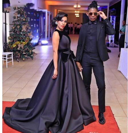 Black Ball Gowns Big Bow Velvet 2018 Long Evening Dresses Long Black Satin African Prom Dresses abendkleider