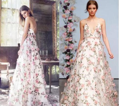 Printed Floral Prom Dresses Long Organza Engagement Dress Open Back Evening Party Gowns Sexy V-Neck Formal Dress