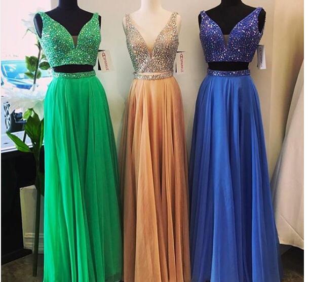 Sexy Two Pieces Prom Dress, Luxury Royal Blue/Green/Champagne 2 Pieces Prom Dress, Beads Satin Long Prom Dresses