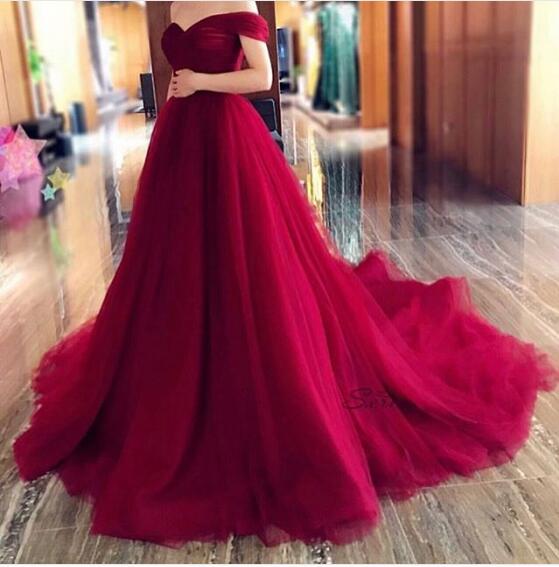 Elegant Prom Dress, Burgundy Prom Dress, Off Shoulder Prom Dresses Tulle Long Prom Dress Evening Dress