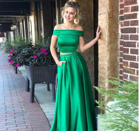 Jade Green Off The Shoulder Two Piece Prom Dresses Crystal Satin Floor Length Long Prom Dresses Evening Party Dress