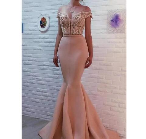 Evening Dresses 2018 Sexy Pink Off Shoulder Keyhole Lace Appliques Crystal Beaded Mermaid Long Satin Formal Party Dress Celebrity Prom Gowns