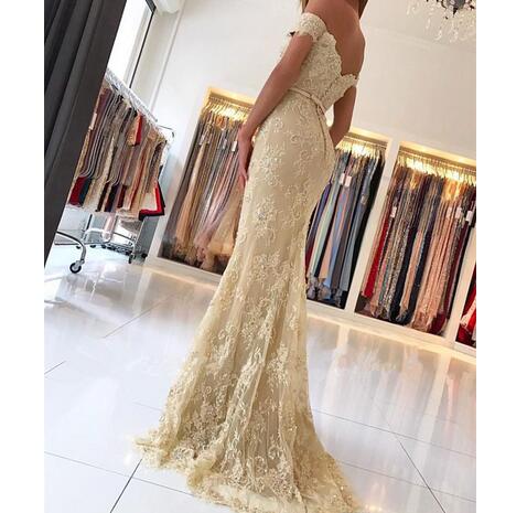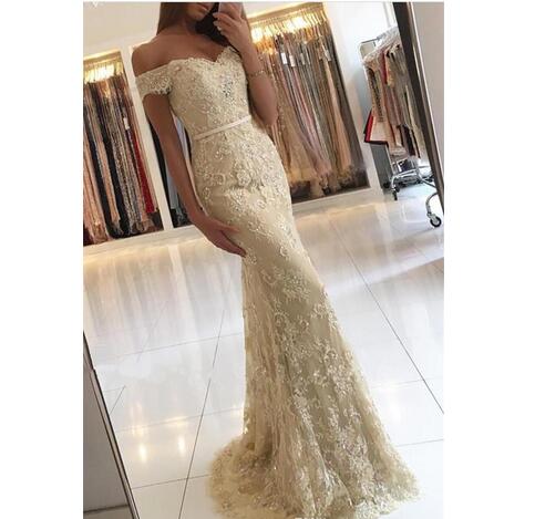 2018 New Sexy Champagne Evening Dresses Sweetheart Off Shoulder Full Lace Beaded Mermaid Party Dress Zipper Back Sweep Train Party Gowns
