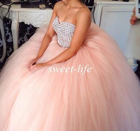 2018 Cheap Ball Gown Quinceanera Dresses Blush Pink Tulle Sweetheart Beads Sweep Train Custom Made Sweet 16 Prom Dress Gowns for Quinceanera