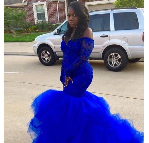 Plus Size Royal Blue Long Sleeve Prom Dresses Black girl Elegance Lace Tutu Evening Dresses African Lady formal Event Gowns