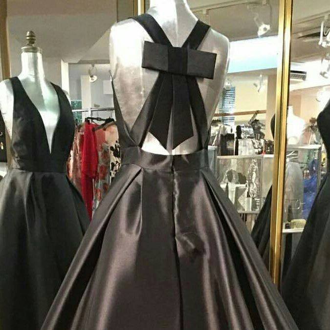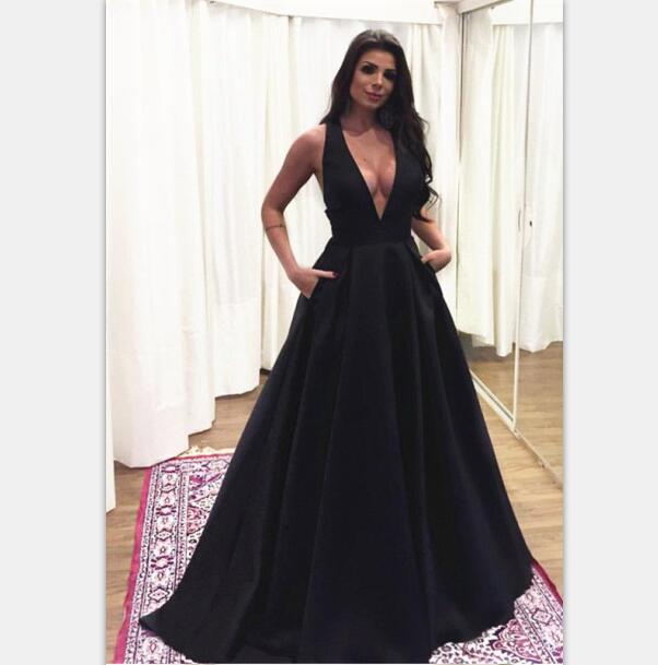 Black Prom Dress, Long Prom Dress, Satin Prom Dress, V-neck prom Dress, Elegant Prom Dress, Simple Prom Dress, Open Back Evening Formal Party Gowns