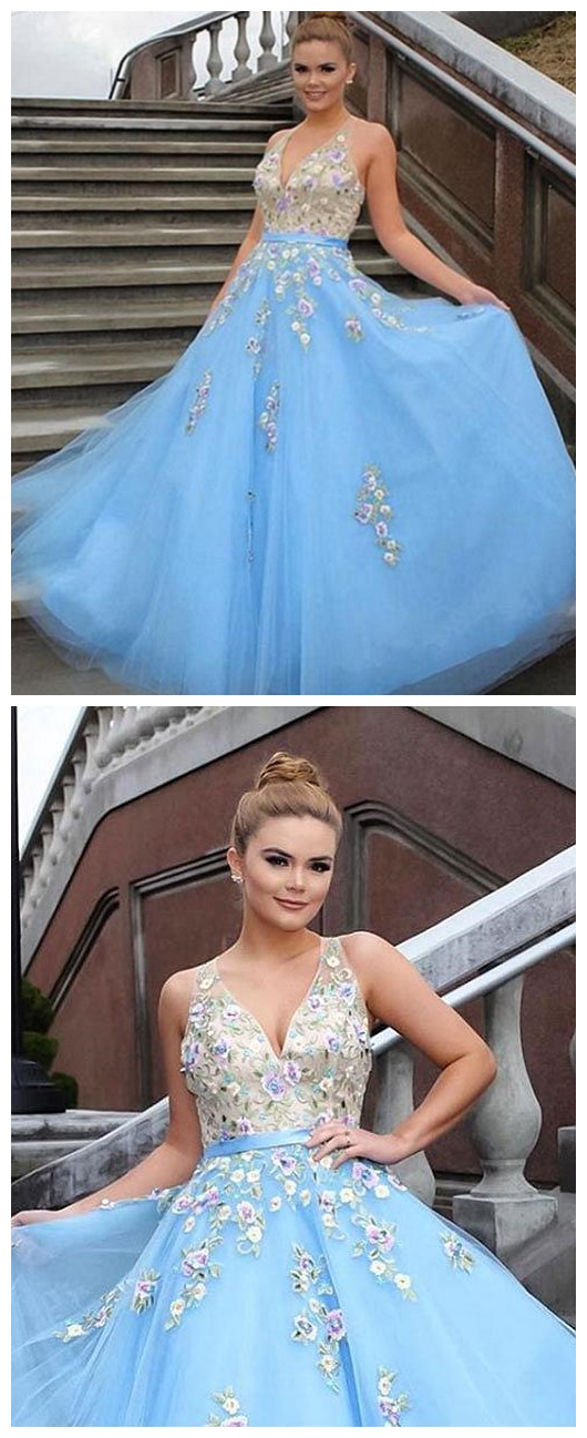 Light Blue Prom Dresses,Tulle Prom Gown,Applique Prom Dress,Formal Evening Dress,Formal Women Dress