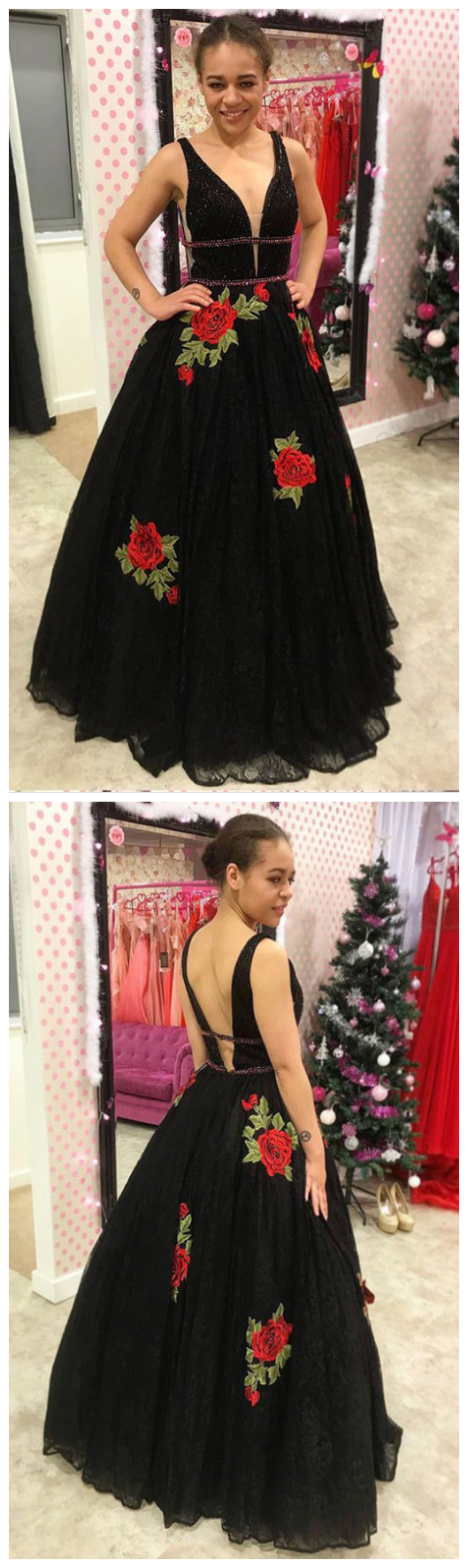 Evening Dress,A-Line Prom Dresses,Deep V-Neck Prom Gown,Backless Prom Dress,Black Prom Dress,Lace Prom Dress with Beading Appliques