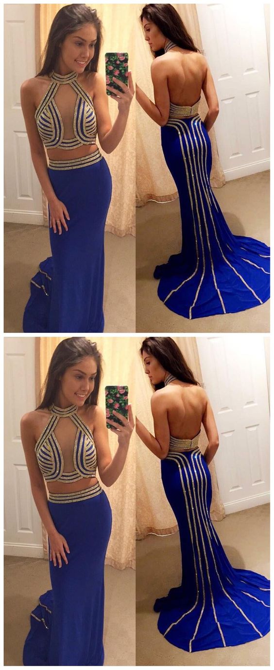 Halter Prom Dress, Two Piece Mermaid Prom Dress, Gold Long Prom Dresses , Evening Formal Gowns