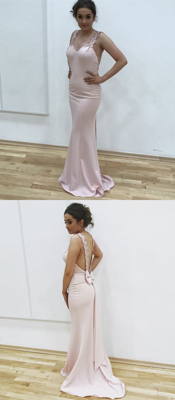 Mermaid Straps Backless Sweep Train Pink Prom Dress with Bowknot,Evening Formal Gowns
